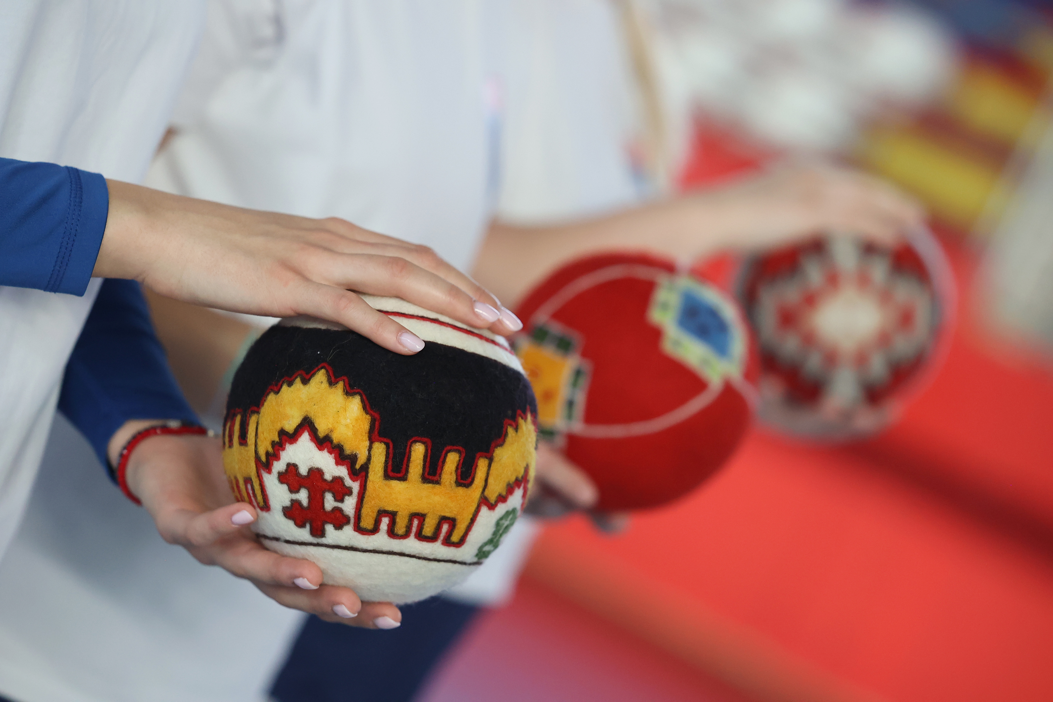 Felt balls are considered to be the oldest toys that children used to make by hand-rolling animal hairs, usually with a desire to fill the time and entertain themselves while watching over cattle. Felt balls are made by Ethno Network by the traditional method of hand-rolling of wool and making balls of different sizes, with various designs, some containing rice in the middle that produce a pleasant rattling noise as the ball is rolling. Large balls are used as interior decoration and a unique gift with motifs of a sleeveless overcoat or Solomon’s knot.