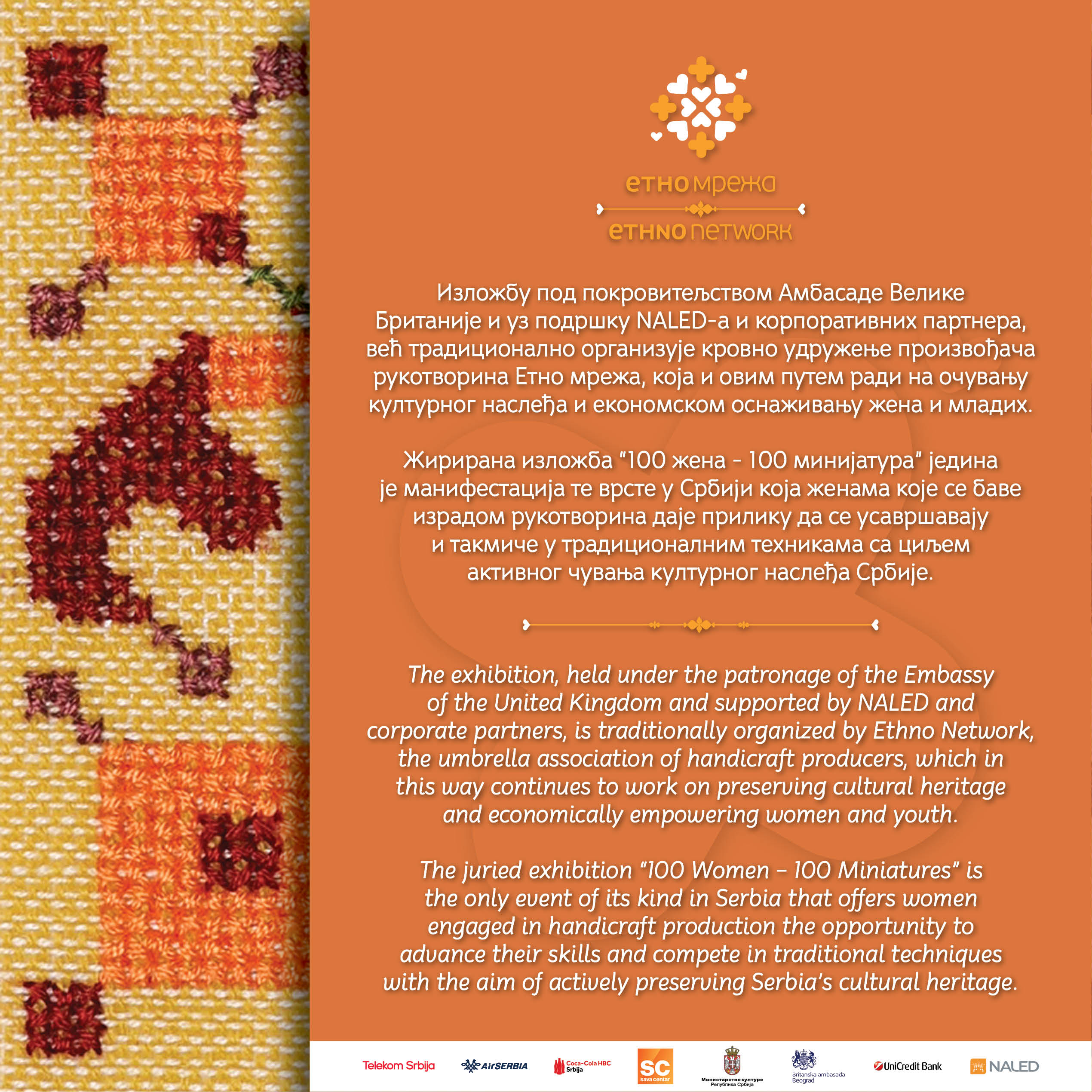 Minijatura je figuralni ili floralni prikaz malog formata izrađen u različitim tehnikama. Minijature Etno mreže kao eksponati žirirane izložbe pod nazivom „Sto žena – sto minijatura“, autentičnim motivima spajaju umetnost i veštinu, tradicionalno i savremeno, individualno i kolektivno, i odišu zaboravlјenim duhom narodne umetnosti.